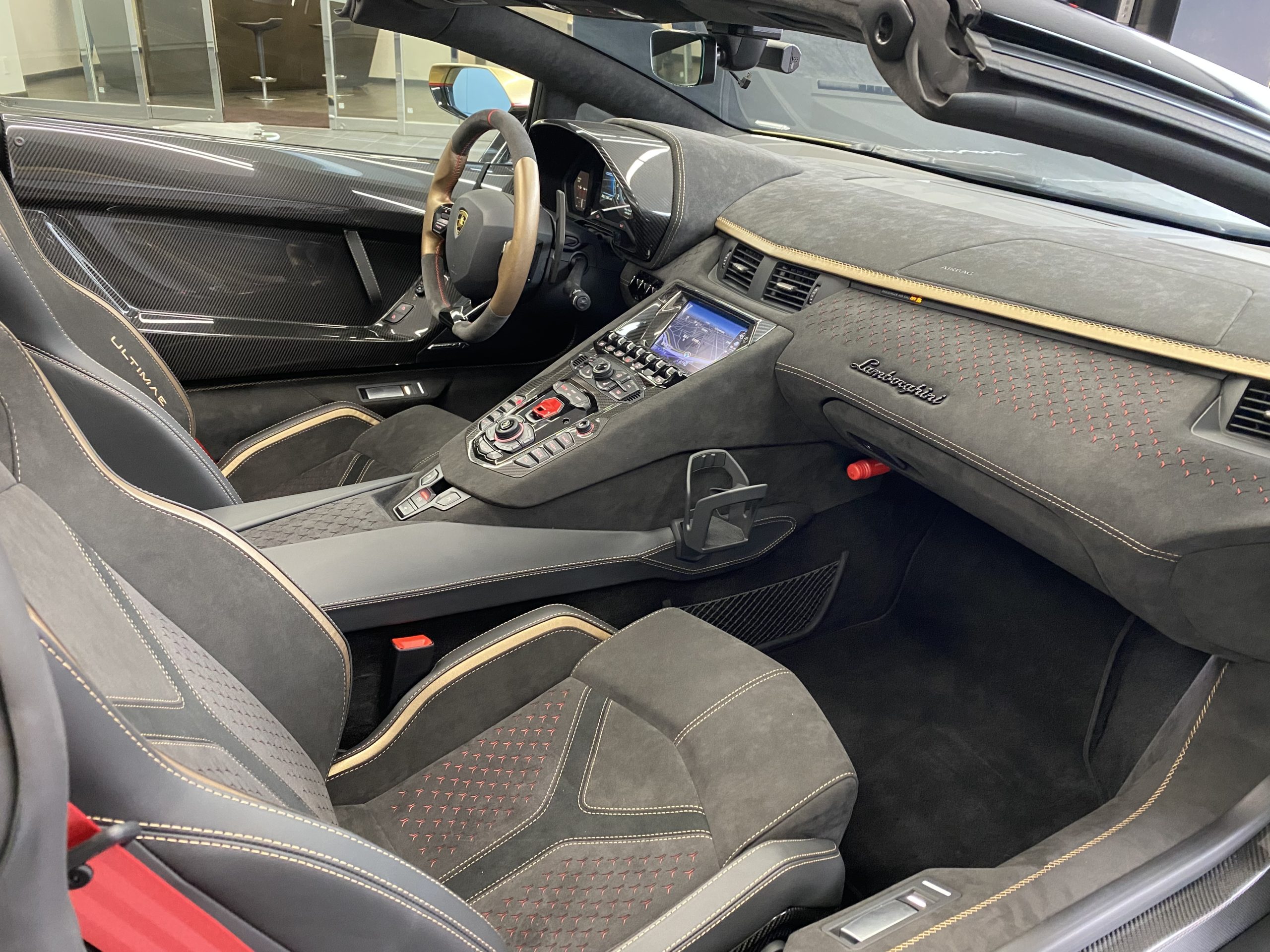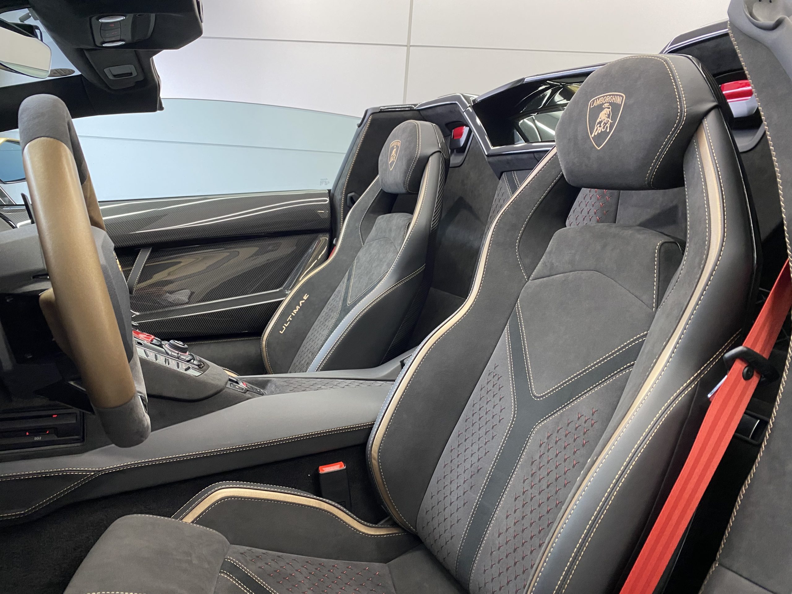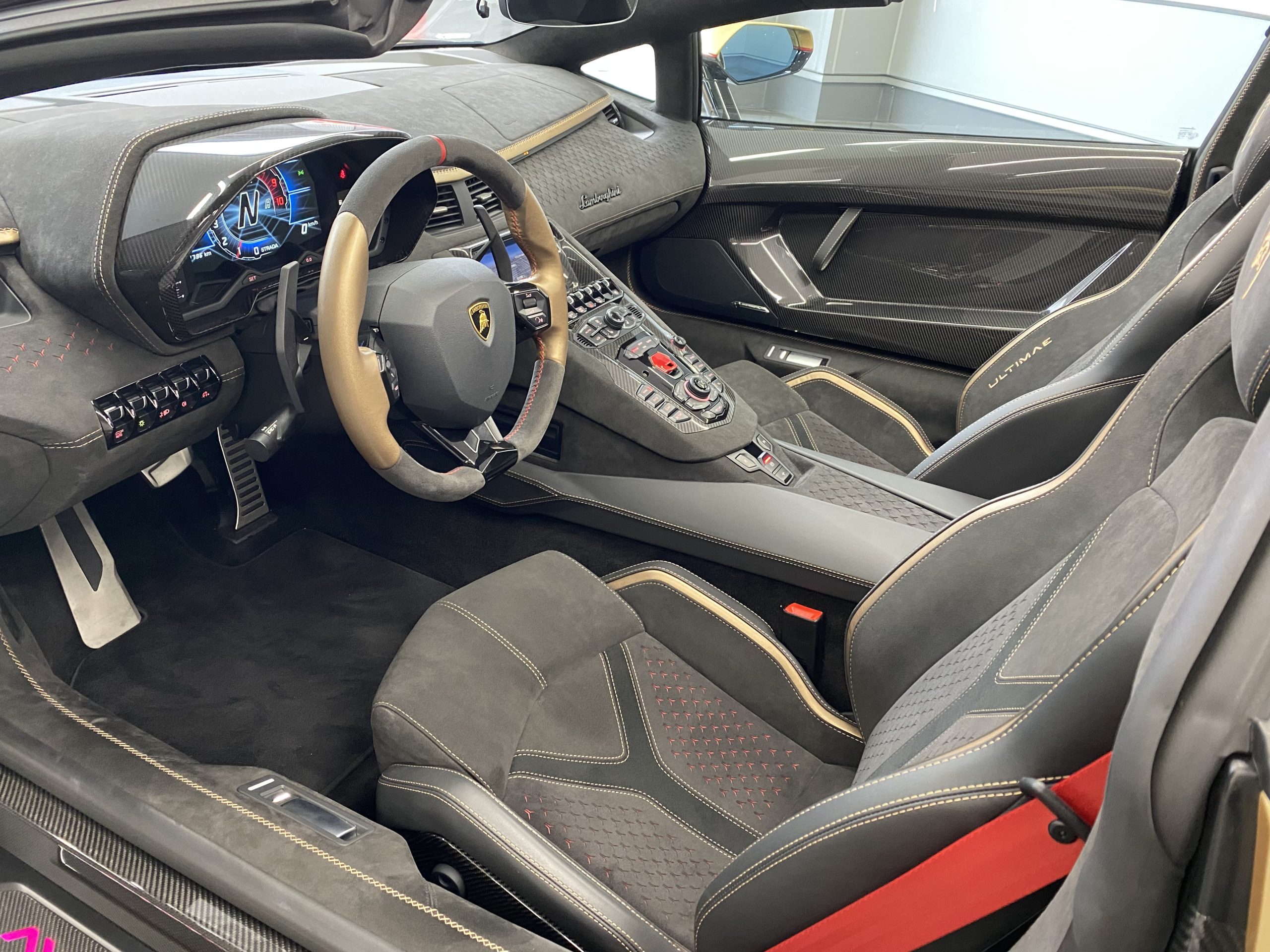 Aventadorシリーズ最新傑作モデルのインテリアを特徴づけるのは、高級感と洗練されたスタイルです。特に重要な仕上げ部分に採用されているカーボンファイバーや、裏地のカラーが見えるようにY型にレーザー加工されたAlcantara®などの機能性に優れた高級素材が、ラグジュアリーな室内の個性的なアクセントとして光ります。