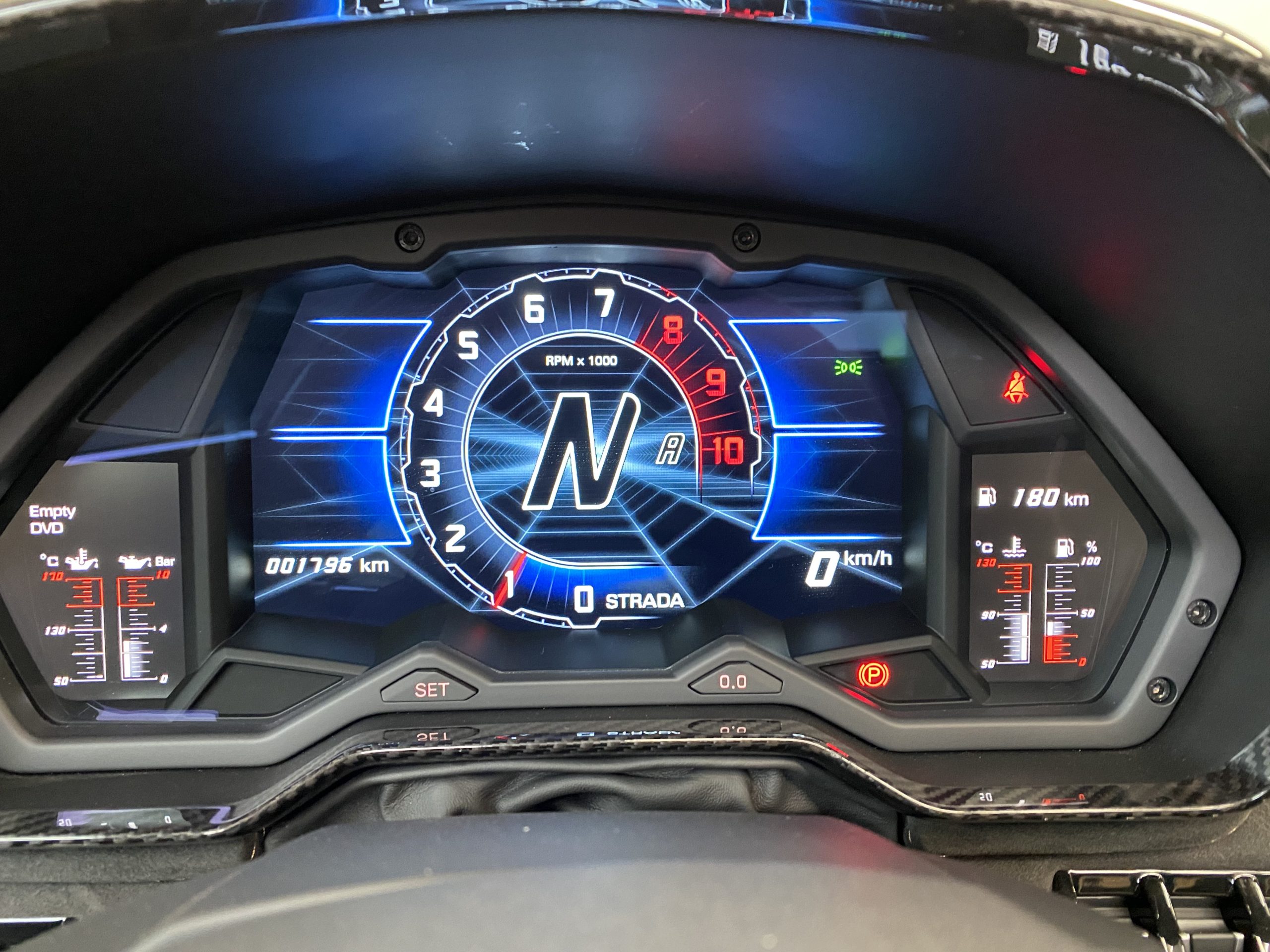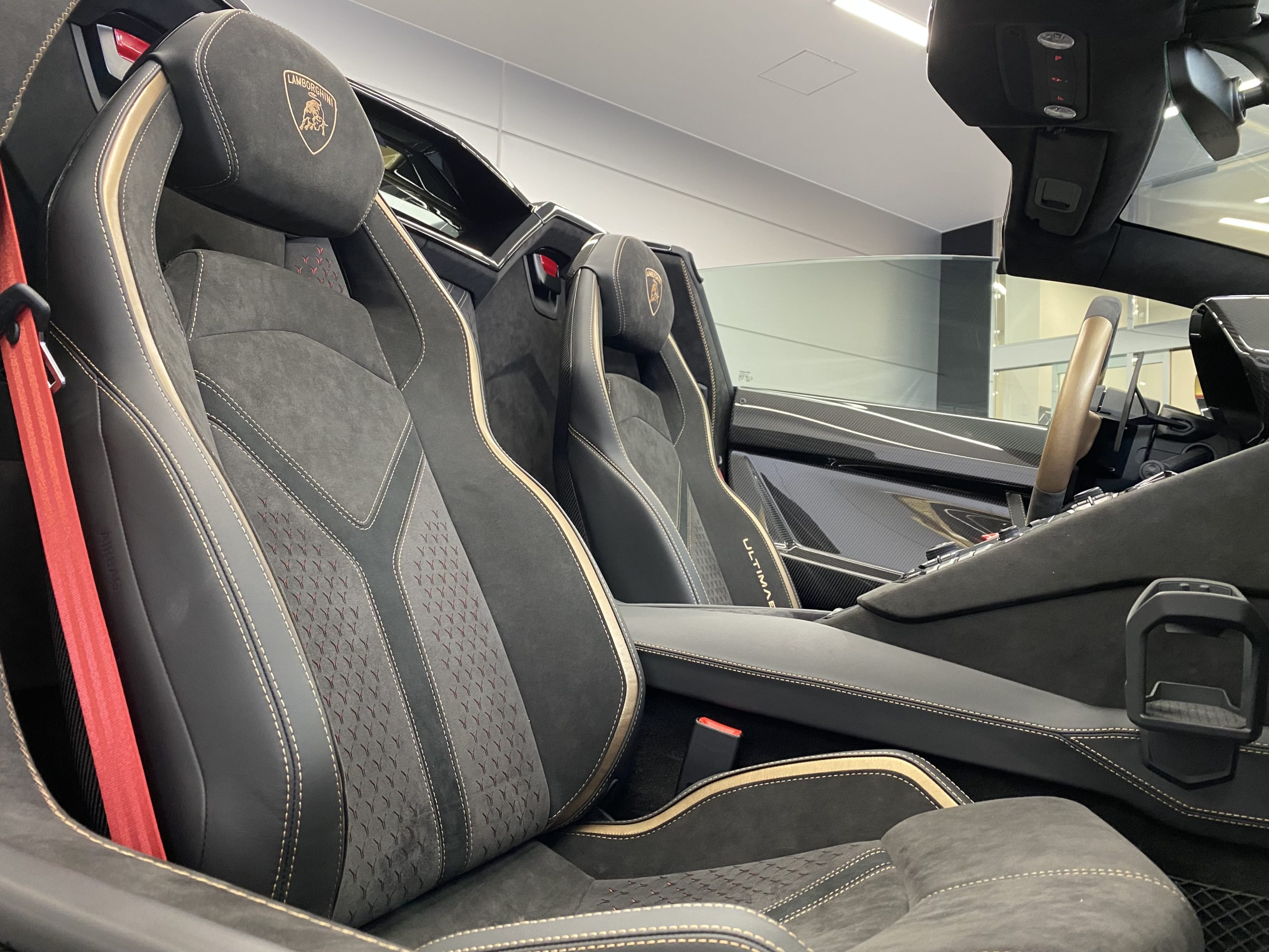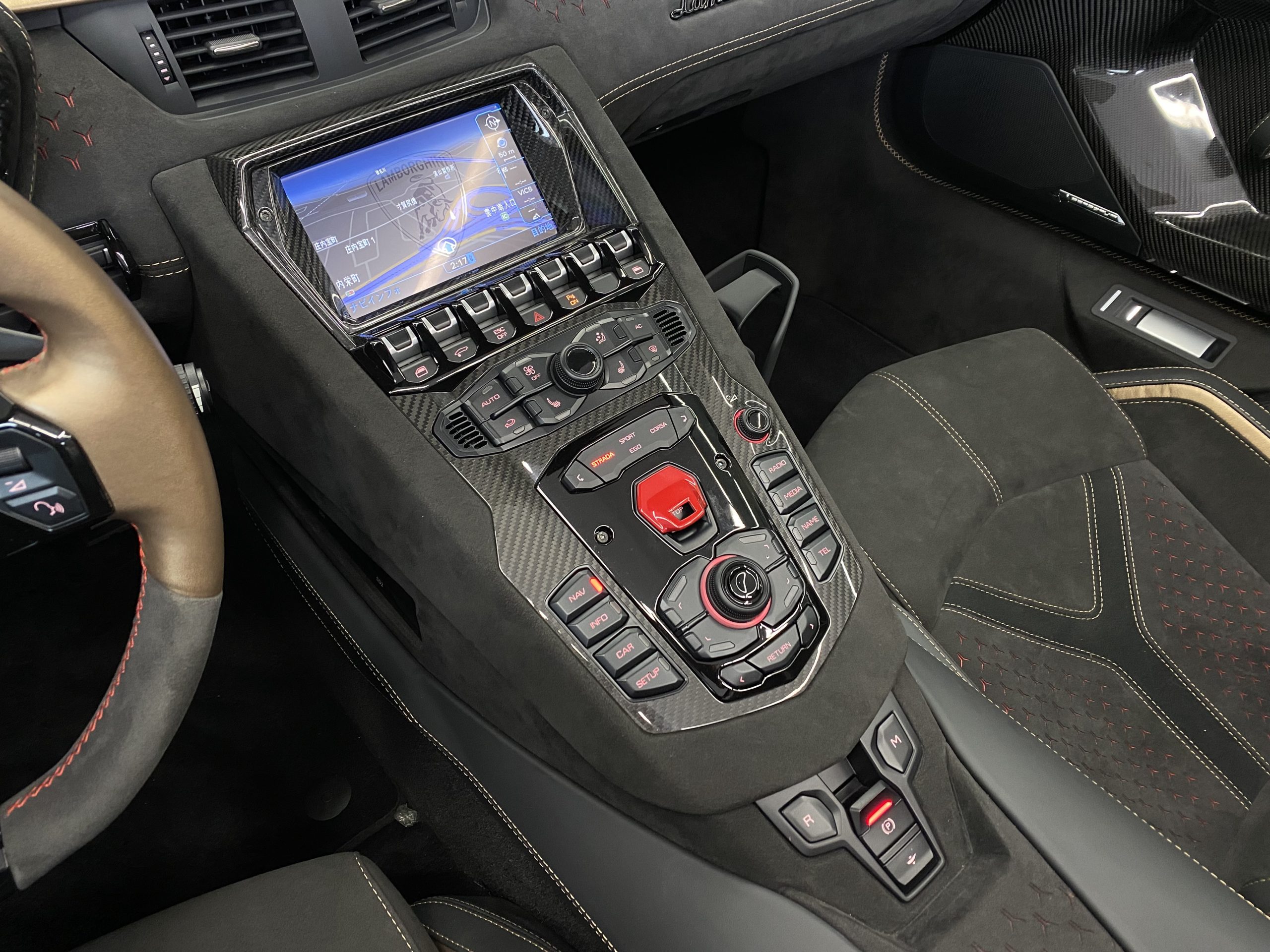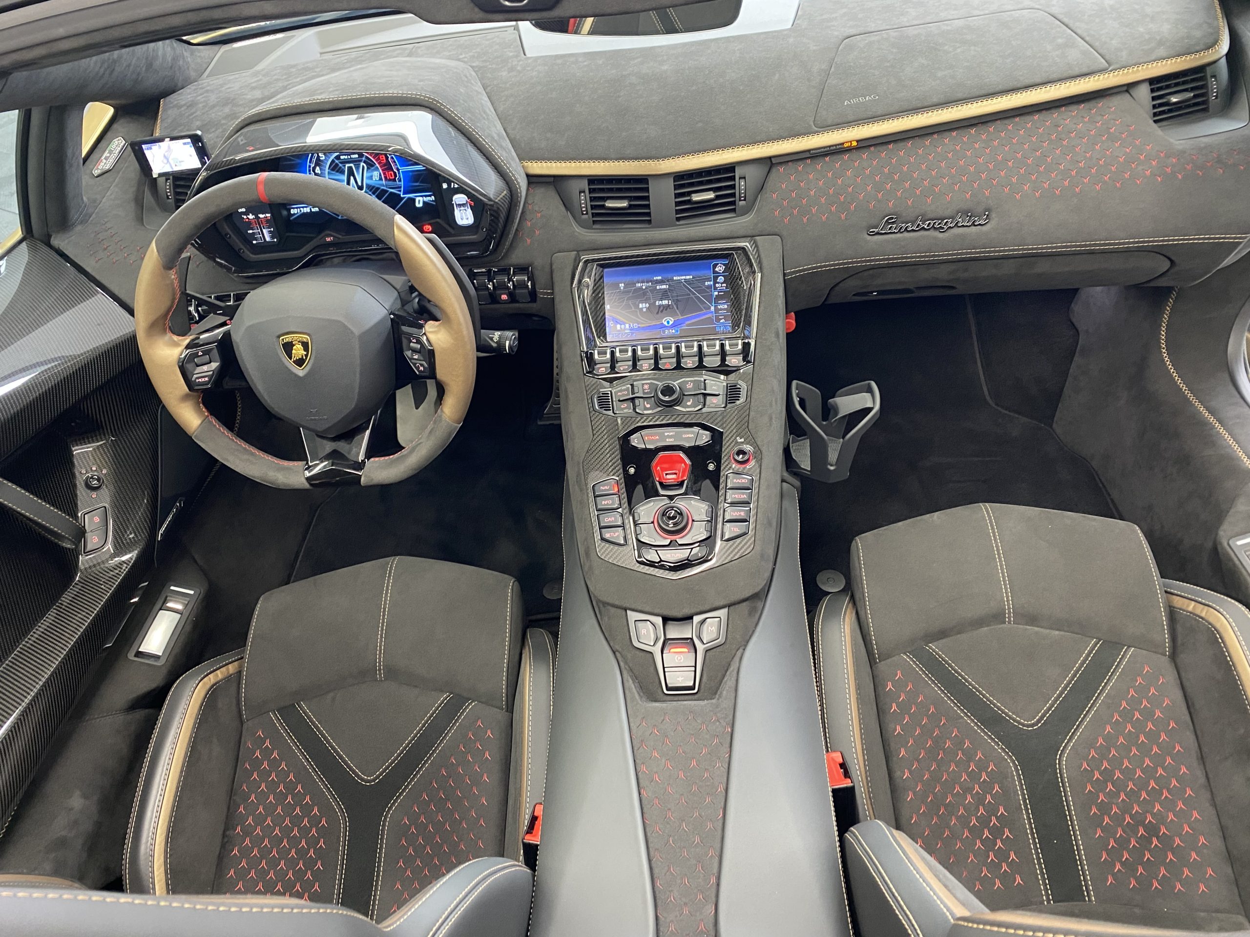 Aventadorシリーズ最新傑作モデルのインテリアを特徴づけるのは、高級感と洗練されたスタイルです。特に重要な仕上げ部分に採用されているカーボンファイバーや、裏地のカラーが見えるようにY型にレーザー加工されたAlcantara®などの機能性に優れた高級素材が、ラグジュアリーな室内の個性的なアクセントとして光ります。