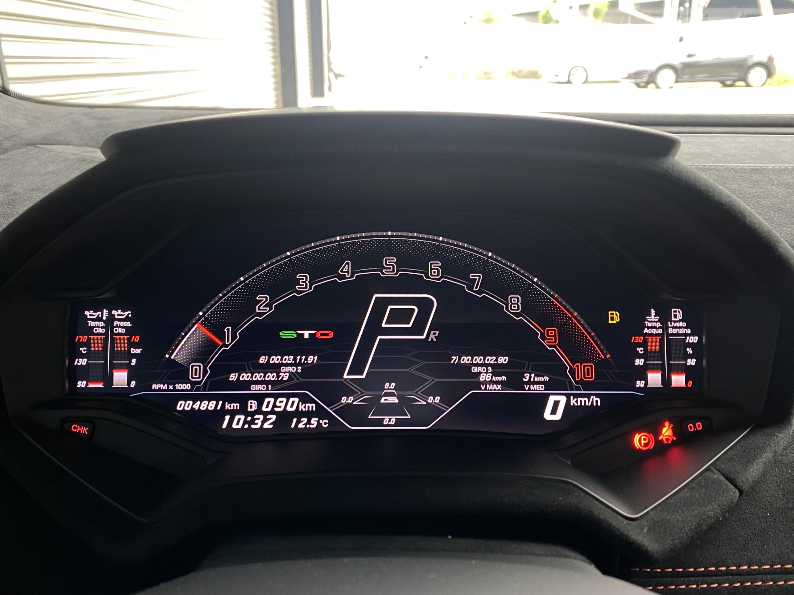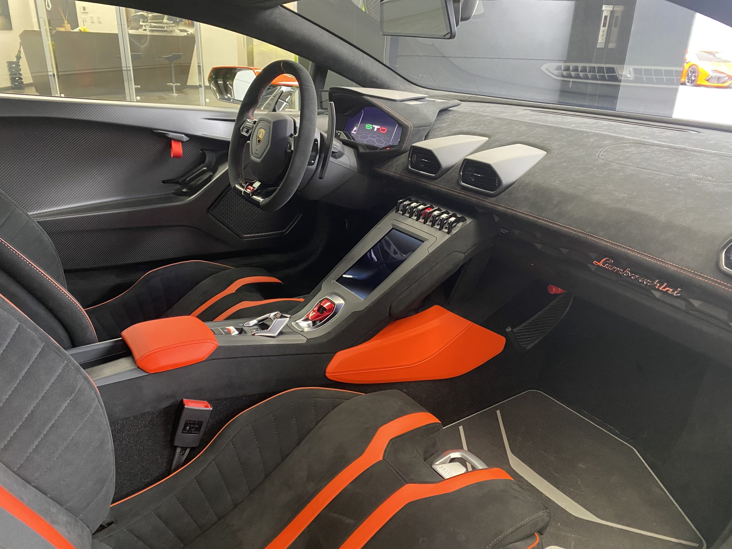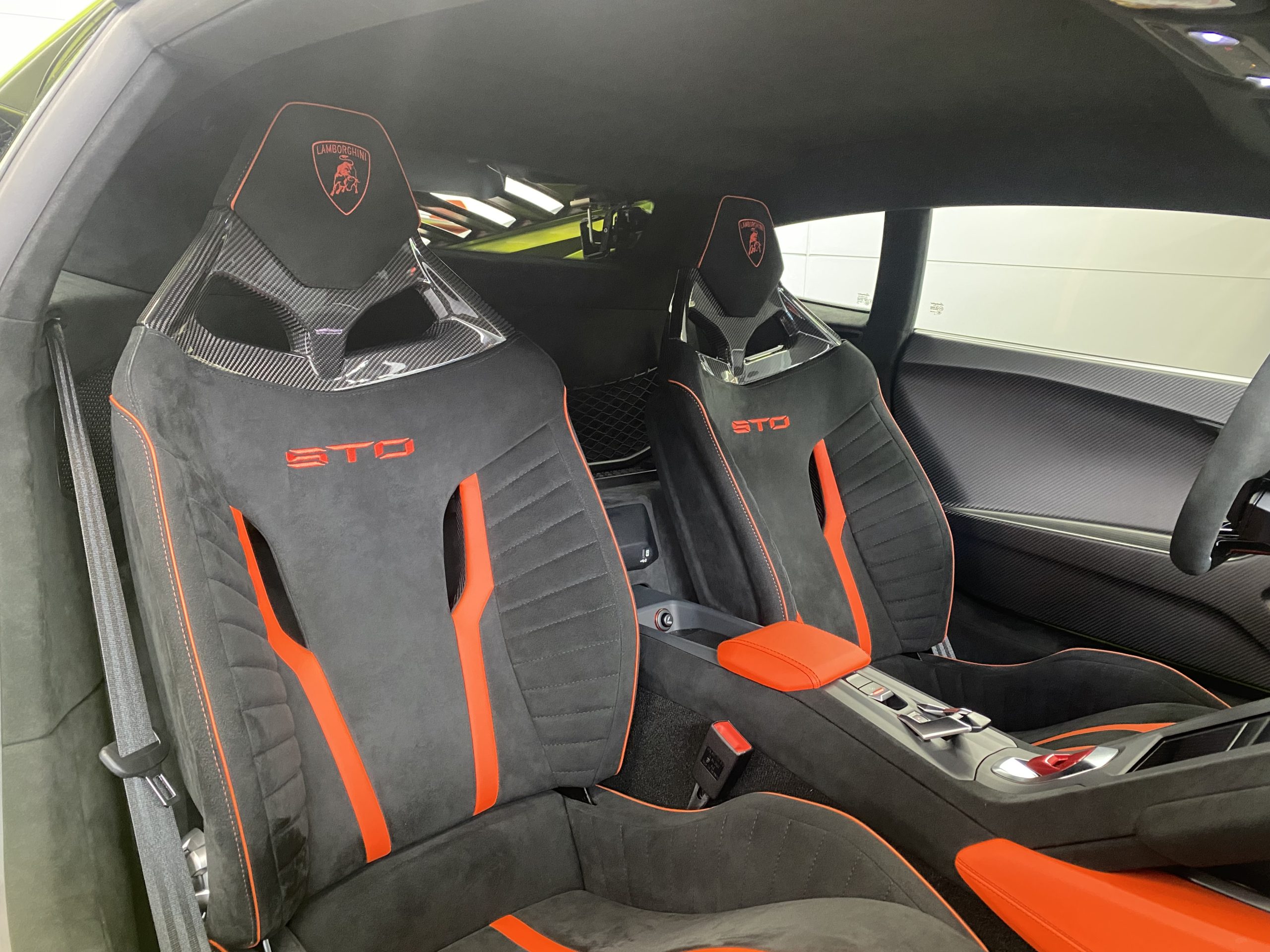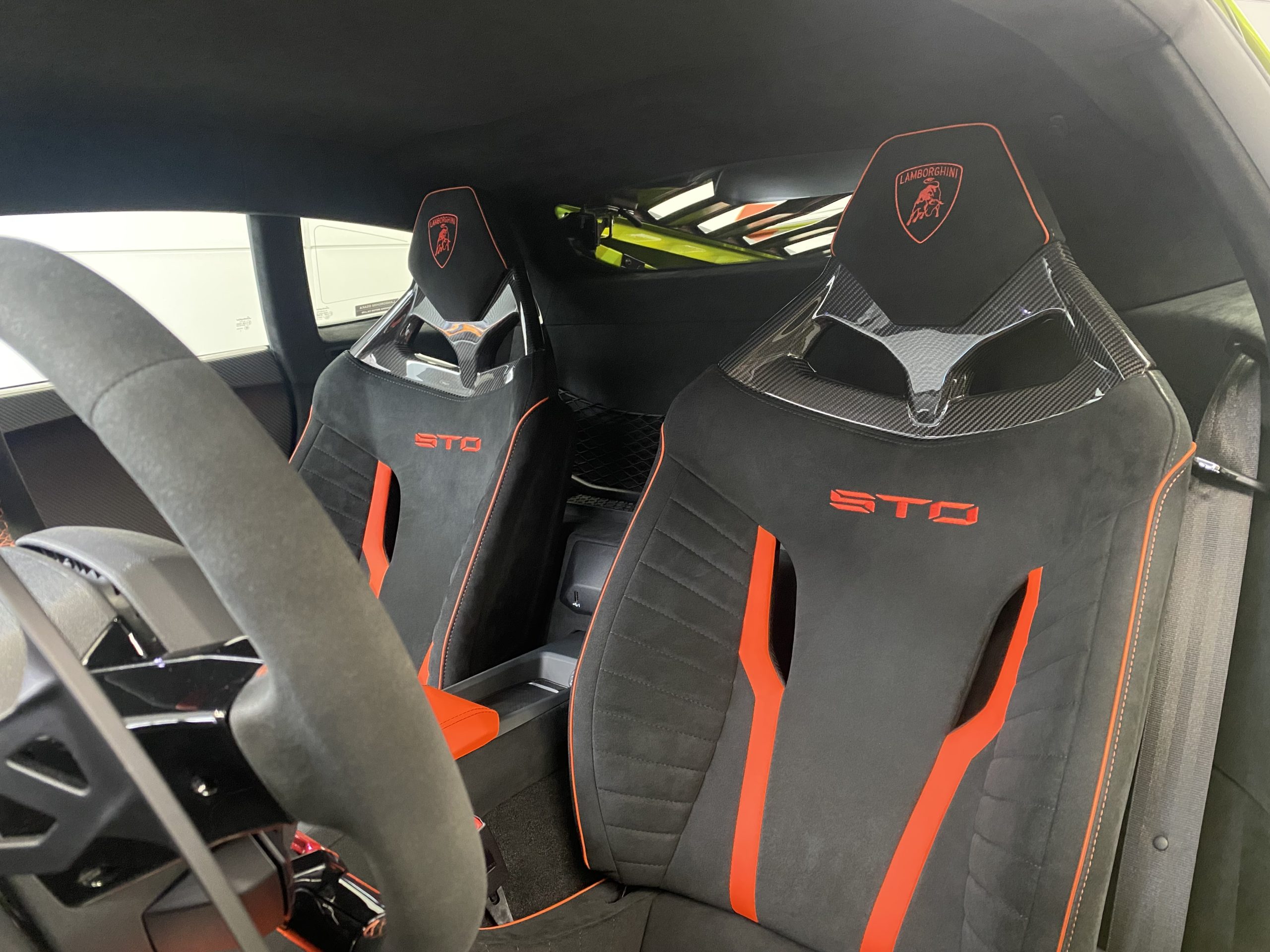 Huracán EVOを思い起こさせる新型Huracán STOのインテリア・ソリューションは、以前のモデルと比較して全体的な軽量化に貢献しています。新しいトリムや4点式**シートベルト付きチタンロールバーなどの追加機能も加わり、ハンドルを握った瞬間から他では味わえない感動を体感できる本物のレーシングマシンに仕上がっています。